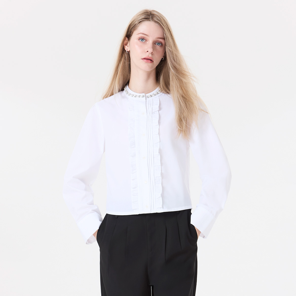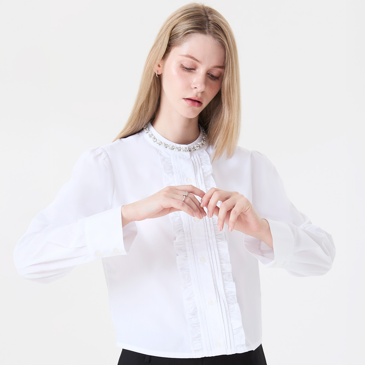1,795.00 ฿Original price was: 1,795.00 ฿.1,615.50 ฿Current price is: 1,615.50 ฿.เติมเสน่ห์แบบสุภาพสมบูรณ์แบบด้วย เสื้อเบลาส์คอปักประดับมุกคอกลมสีออฟไวท์ แต่งระบายแนวกลางลำตัว ดีไซน์ที่ให้มิติในแบบเรียบง่ายแต่ดูมีรายละเอียด คอเสื้อประดับด้วยมุกและคริสตัล จัดเรียงอย่างประณีต เพิ่มความละเมียดละไมให้ลุคโดยไม่ต้องพึ่งเครื่องประดับ ผ้าเนื้อนุ่ม เบา และคงรูป ให้ทรงเสื้อสวยตลอดวัน เหมาะสำหรับลุค feminine ดูดีในทุกโอกาส คำอธิบายสินค้า : – เสื้อเบลาส์คอปักประดับด้วยมุกและคริสตัล คอกลมสีออฟไวท์ – ตกแต่งระบาย กลางลำตัว – กระดุมสีขาวเรียงตลอดแนวด้านหน้าเสื้อและบริเวณปลายแขน วัสดุ : 80%POLYESTER 20%COTTON คำแนะนำ : สามารถซักด้วยมือหรือเครื่องซักผ้าในโหมดปกติ รีดด้วยอุณหภูมิอ่อน * นางแบบสูง : 175 เซนติเมตร (ใส่ไซซ์ M) ** สินค้าจริงอาจมีสีที่แตกต่าง เนื่องจากแสงในการถ่ายทำและการแสดงค่าสีของจอ