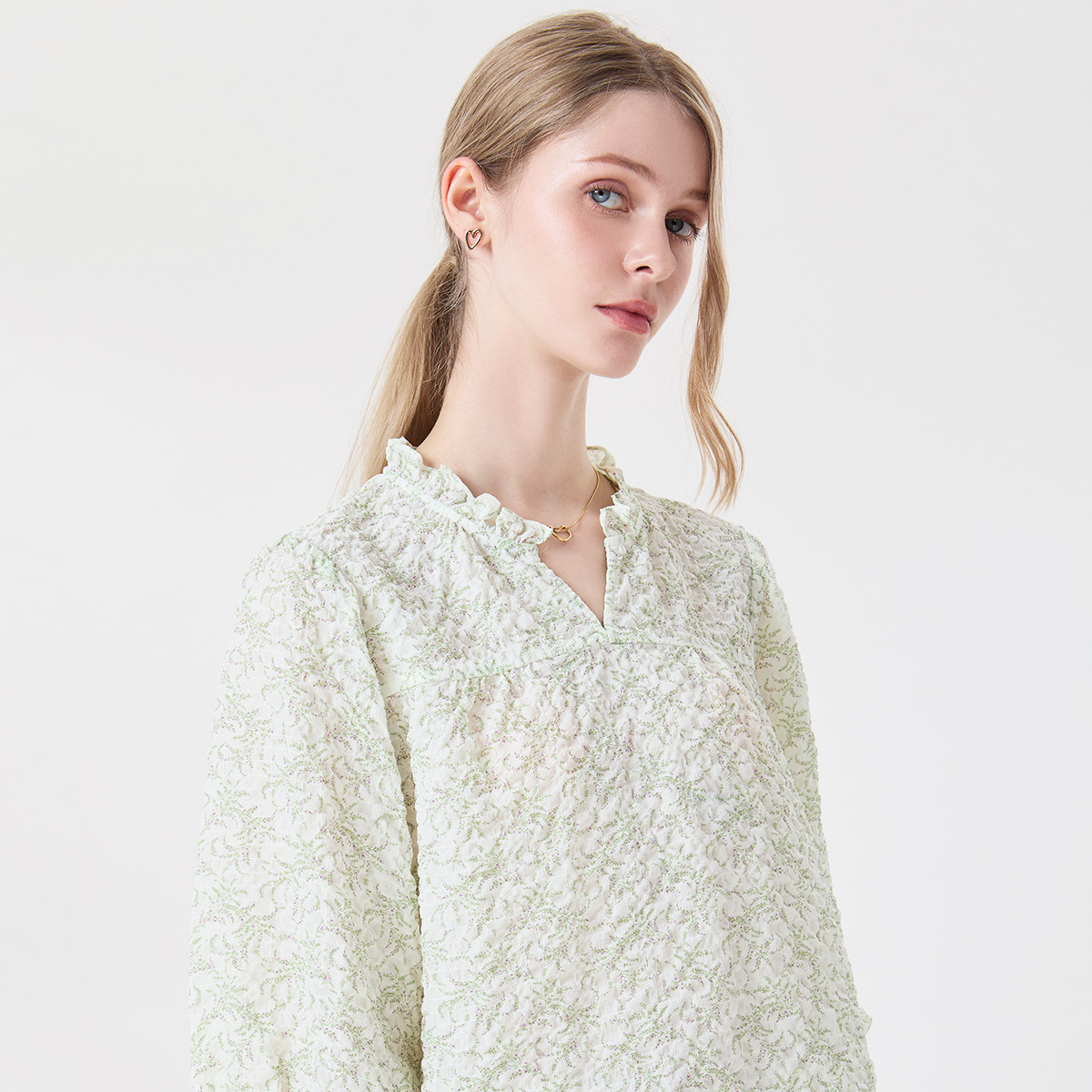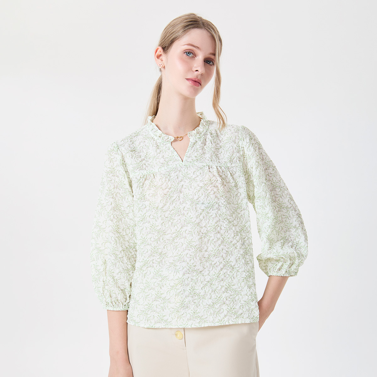 NEWช้อป 2 ชิ้น ลดเพิ่ม 11%-11%คูปองส่วนลด 120 บ. (ขั้นต่ำ 1111 บ.)120.00 ฿1,695.00 ฿Original price was: 1,695.00 ฿.1,525.50 ฿Current price is: 1,525.50 ฿.สร้างลุคหวานละมุนด้วย เสื้อเบลาส์ลายดอกไม้เล็กๆ สีเขียวอ่อนผสมกับ สีออฟไวท์ ดีไซน์ระบายคอและแขนยาวจั๊มพ์สุดอ่อนโยน เพิ่มมิติให้ลุค แบบไม่เยอะเกินไป เนื้อผ้า Chiffon เนื้อนุ่ม โปร่งเบา และระบายอากาศได้ดี ช่วยให้ดูพลิ้วสวยในทุกการเคลื่อนไหว สีซอฟต์นุ่มนวลช่วยขับผิวให้ดูสว่างละมุน เหมาะกับวันทำงานที่ต้องการความสุภาพ พร้อมกลิ่นอายความโรแมนติกเบาๆ คำอธิบายสินค้า : – เสื้อเบลาส์ลายดอกไม้ สีเขียวอ่อนผสมกับสีออฟไวท์ คอวี – ดีไซน์ระบายคอ แขนยาวปลายแขนจั๊มพ์ วัสดุ : 96%POLYESTER 4%ELASTANE คำแนะนำ : สามารถซักด้วยมือหรือเครื่องซักผ้าในโหมดปกติ รีดด้วยอุณหภูมิอ่อน * นางแบบสูง : 175 เซนติเมตร (ใส่ไซซ์ M) ** สินค้าจริงอาจมีสีที่แตกต่าง เนื่องจากแสงในการถ่ายทำและการแสดงค่าสีของจอ