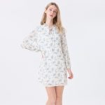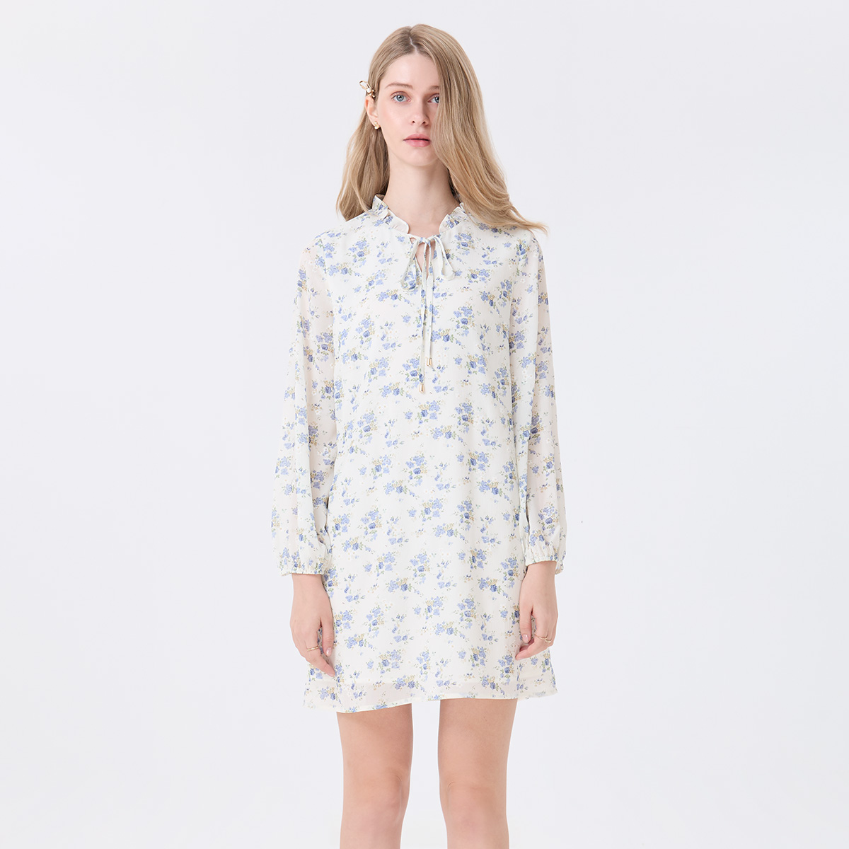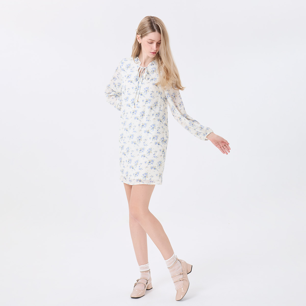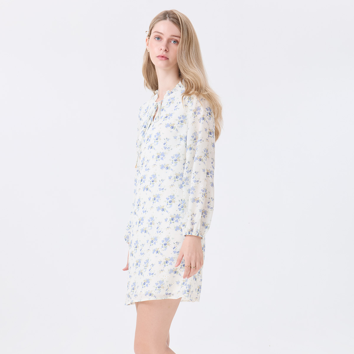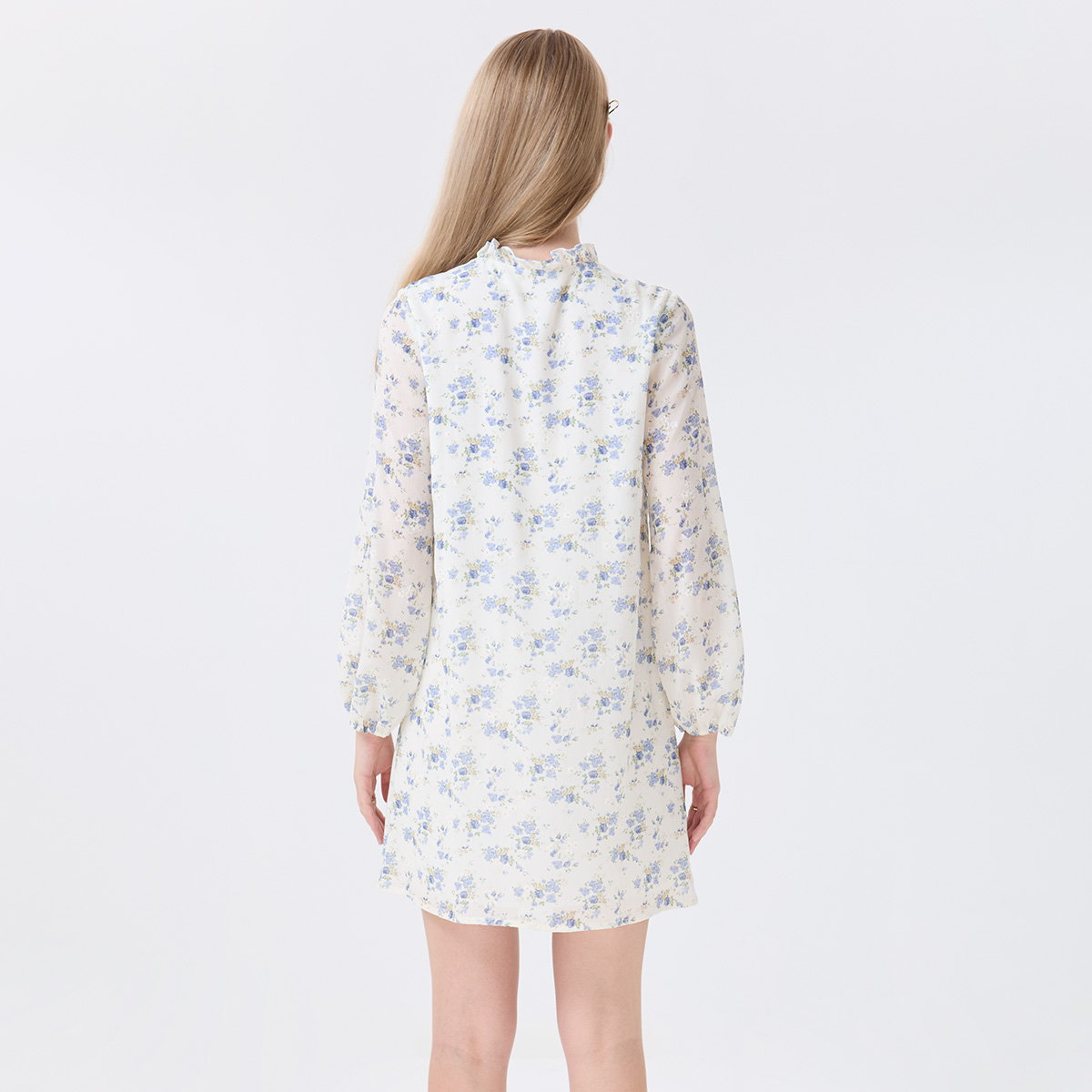 – ชุดเดรสชีฟองลายดอกโทนฟ้าขาว แขนยาว