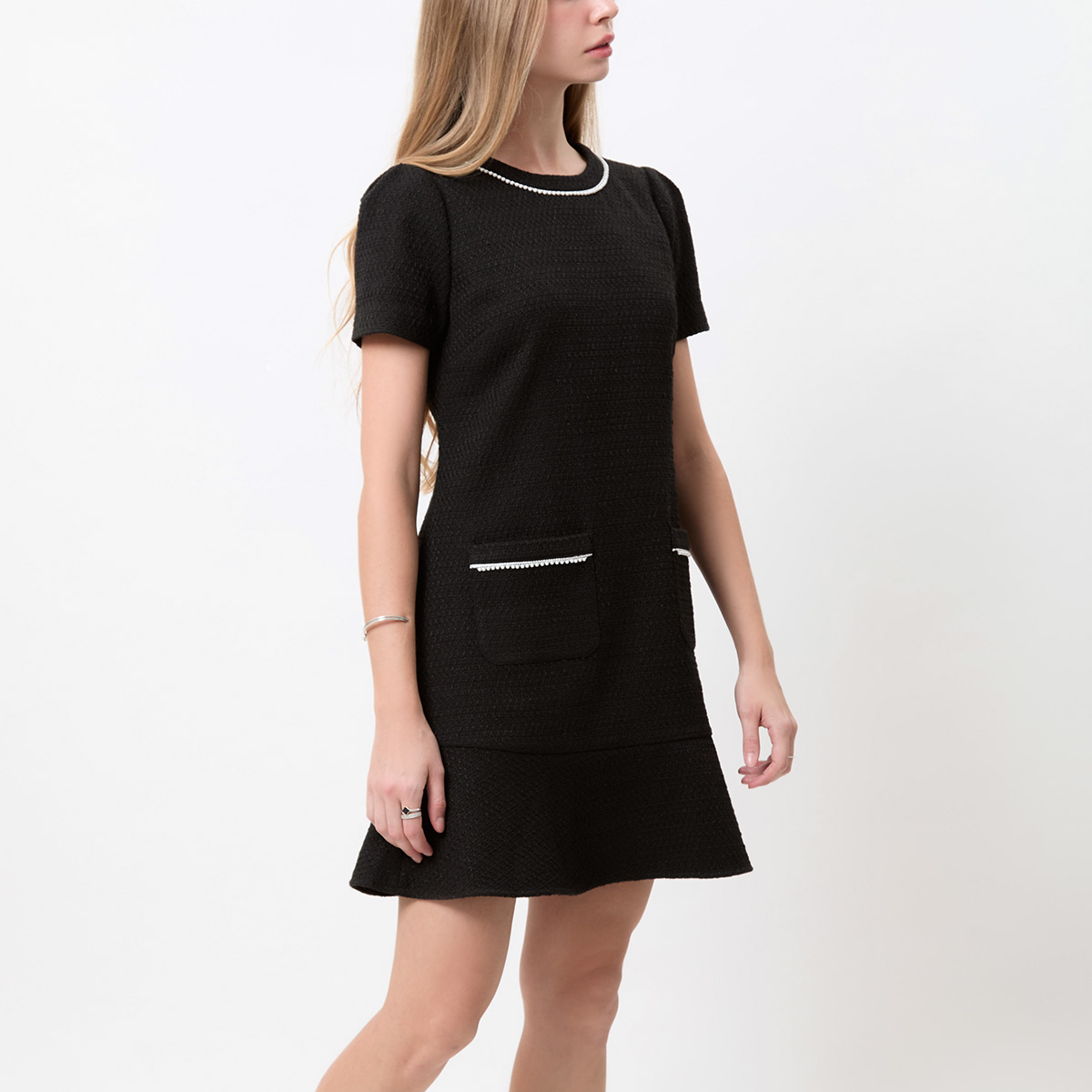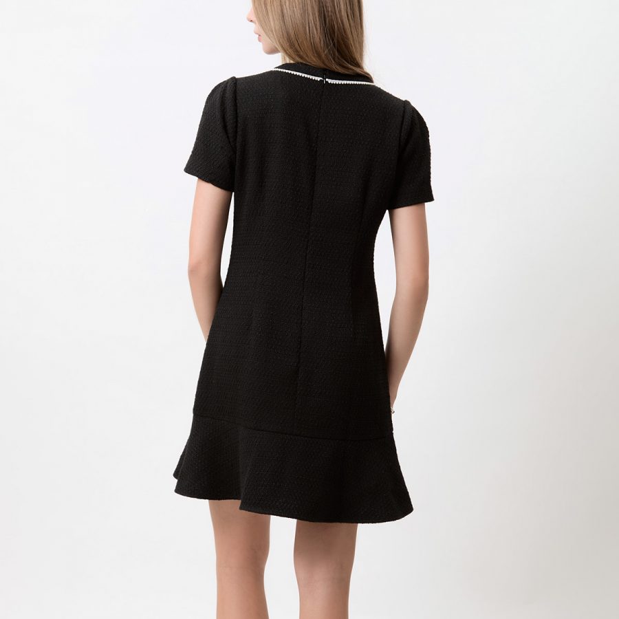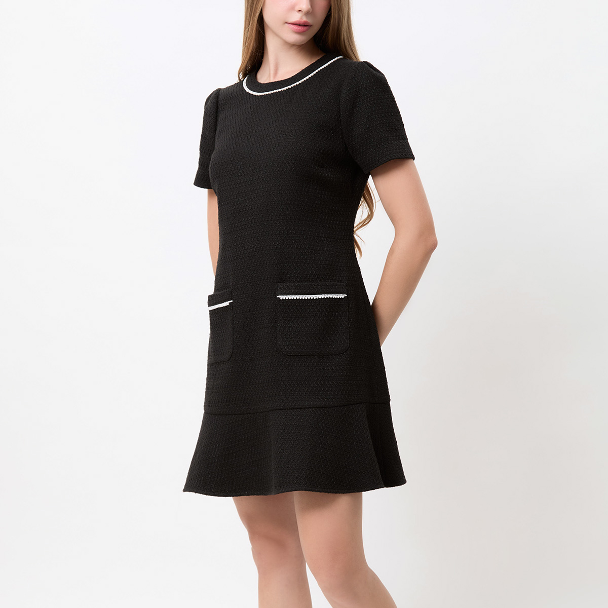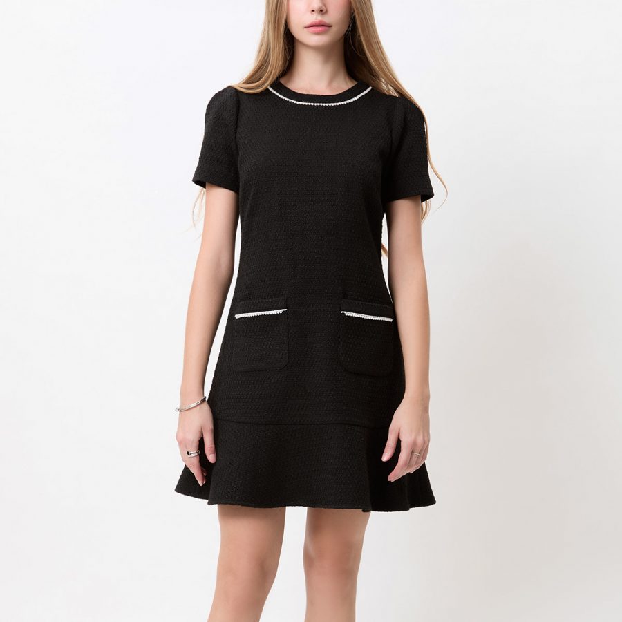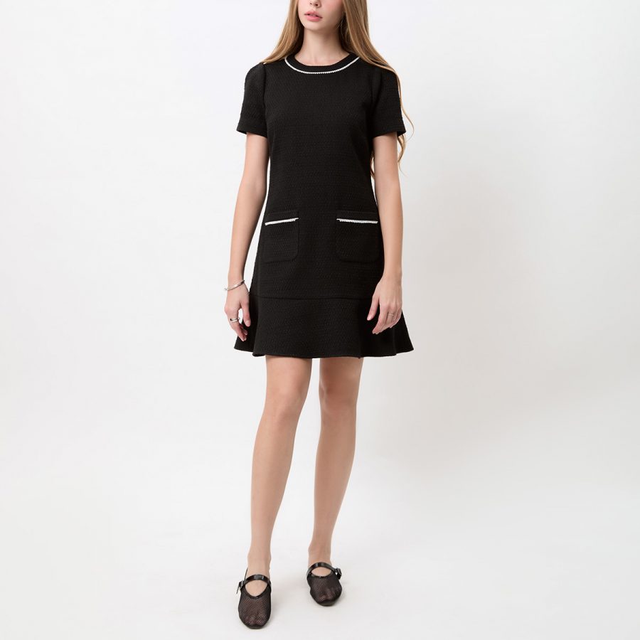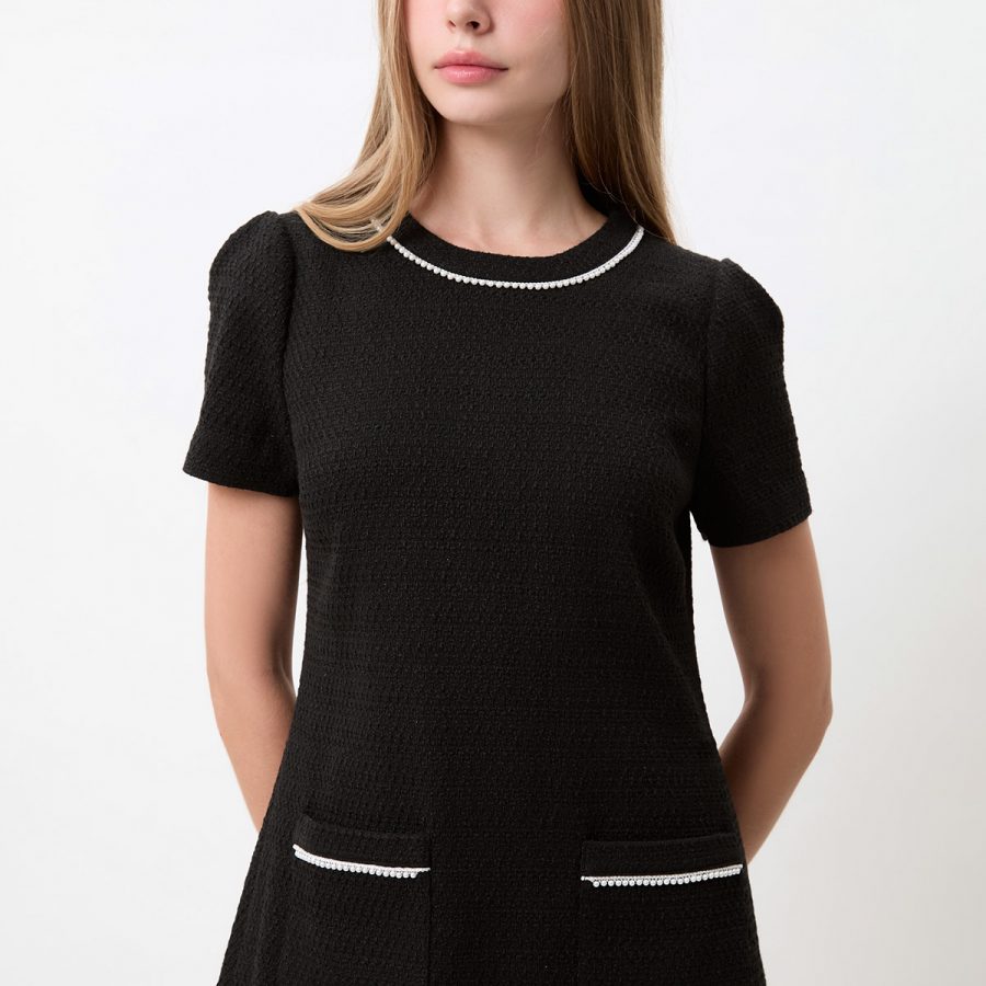 เติมเต็มลุคเรียบหรูเหนือกาลเวลาด้วย เดรสทวีตสีดำสุดคลาสสิกจาก Ep ที่ผสานความสง่างามกับดีเทลอันประณีตอย่างลงตัว โดดเด่นด้วยการตกแต่งแถบไข่มุกรอบคอเสื้อ ช่วยขับลุคให้ดูหรูหราในทุกมุมมอง พร้อมเสริมเสน่ห์ด้วยดีไซน์กระเป๋าด้านหน้าที่ประดับดีเทลมุกเฉพาะตัว เพิ่มความน่าสนใจอย่างมีมิติ