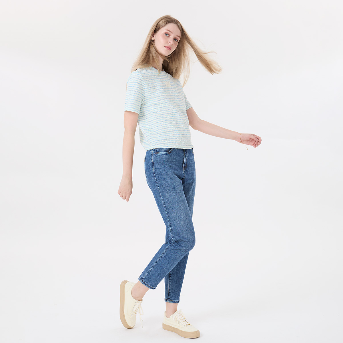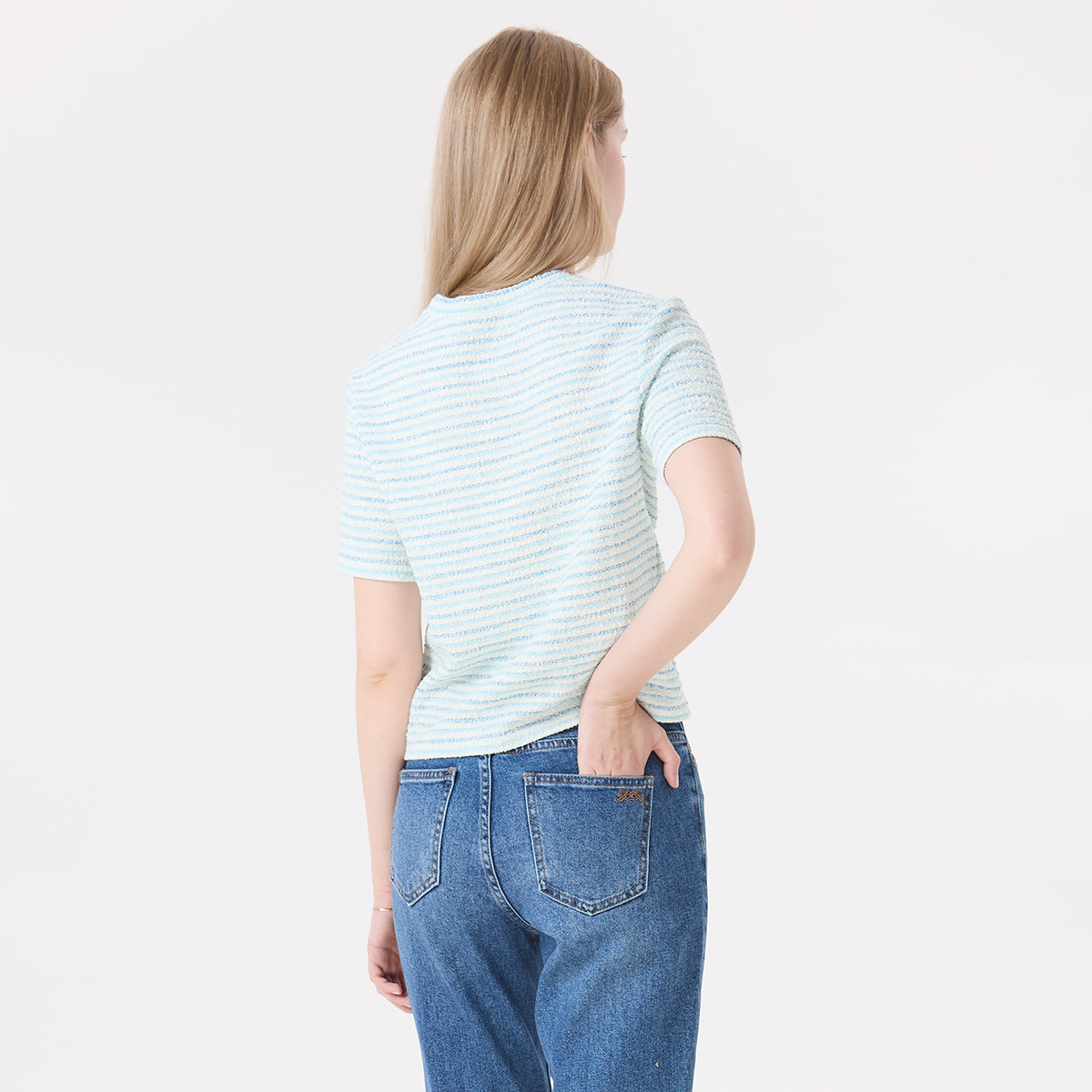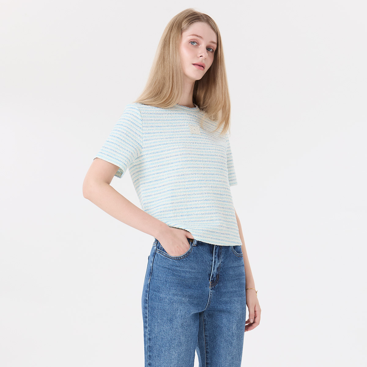 EP เสื้อทีเชิ้ตผ้าทวีตลายทางสีน้ำเงิน ผู้หญิง สีฟ้าอ่อน | Blue Stripe Tweed T-Shirt | 05059