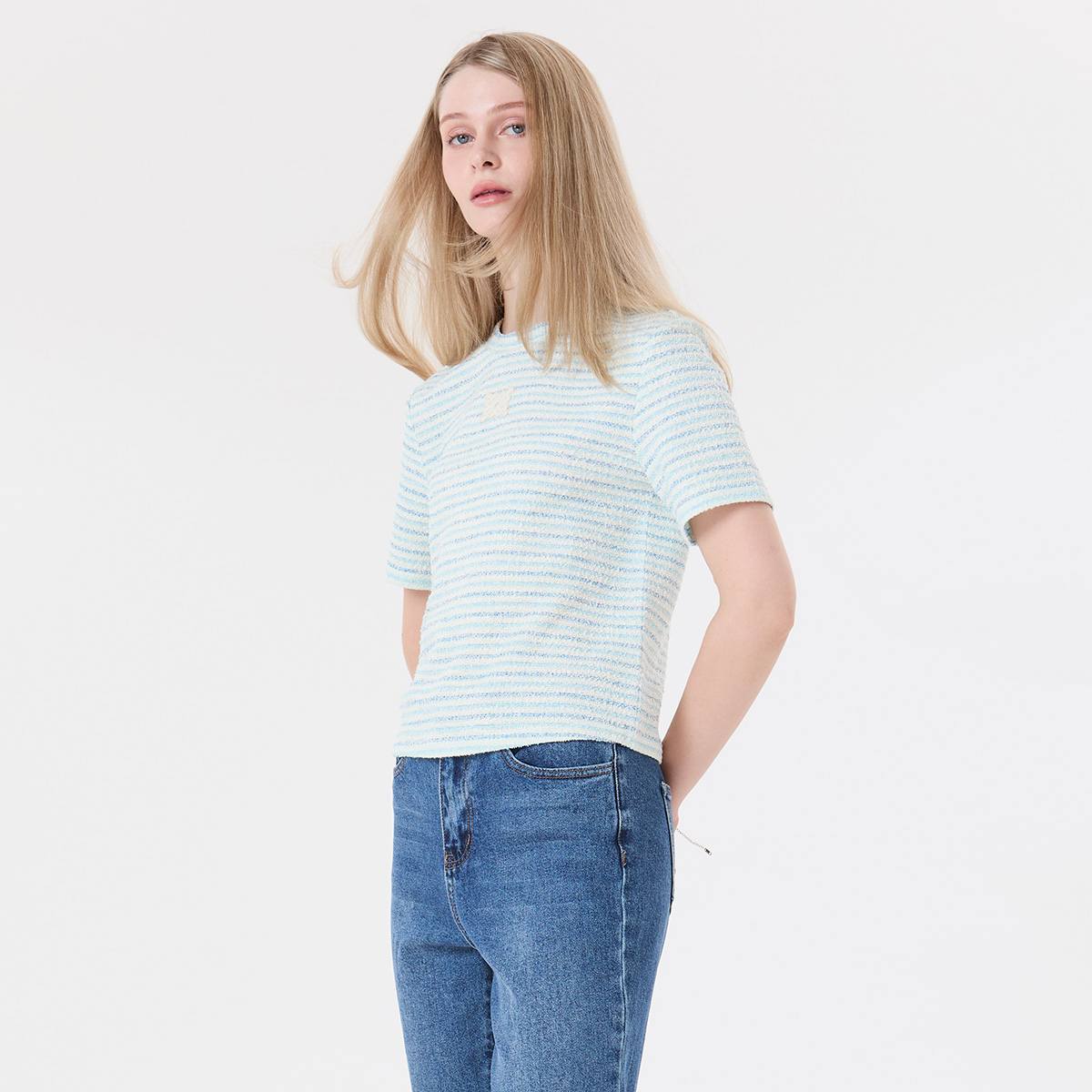 เสื้อทีเชิ้ตผ้าทวีตลายทางสีฟ้าอ่อน คือความสบายในสไตล์ casualได้อย่างลงตัว เนื้อผ้าทวีตที่ทอด้วยเส้นด้ายสีฟ้าอ่อน สีขาว และสีมิ้นท์อย่างประณีต มอบผิวสัมผัสและมิติที่น่าสนใจ แม้จะเป็นเสื้อทีเชิ้ตคอกลมแขนสั้นที่ง่ายๆ  แต่กลับช่วยยกระดับให้ลุคของคุณดูแพงและมีคลาส ทันทีที่สวมใส่ มาพร้อมเอกลักษณ์ด้วย “””” Ep Logo Patch”””” ที่ปักอย่างประณีต ทรงเสื้อที่พอดีตัวสามารถแมตช์ได้ง่ายกับกางเกงยีนส์เอวสูงในวันพักผ่อน หรือใส่คู่กับเบลเซอร์เพื่อลุค Smart Casual ที่โดดเด่นอย่างมีสไตล์ ได้ทุกวัน