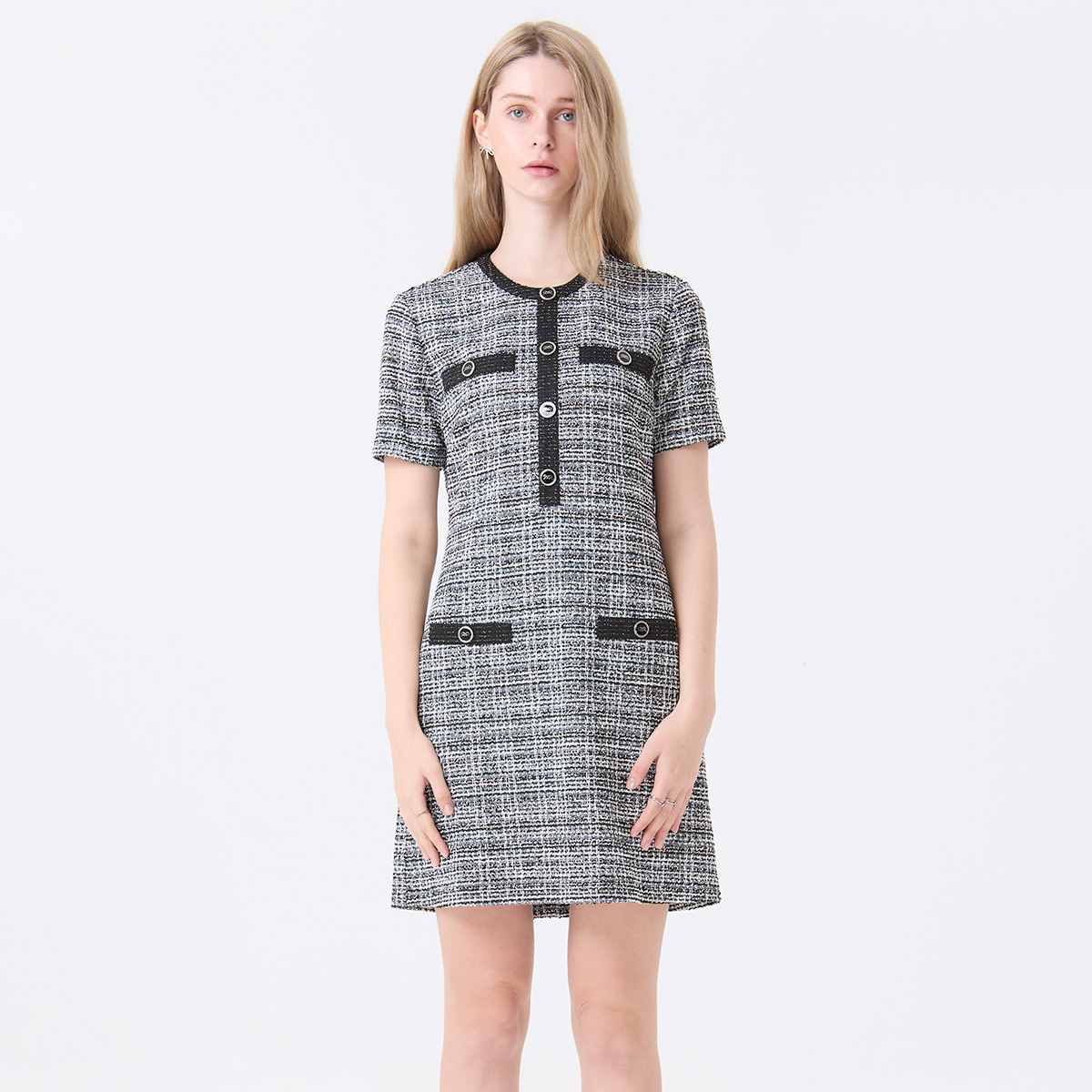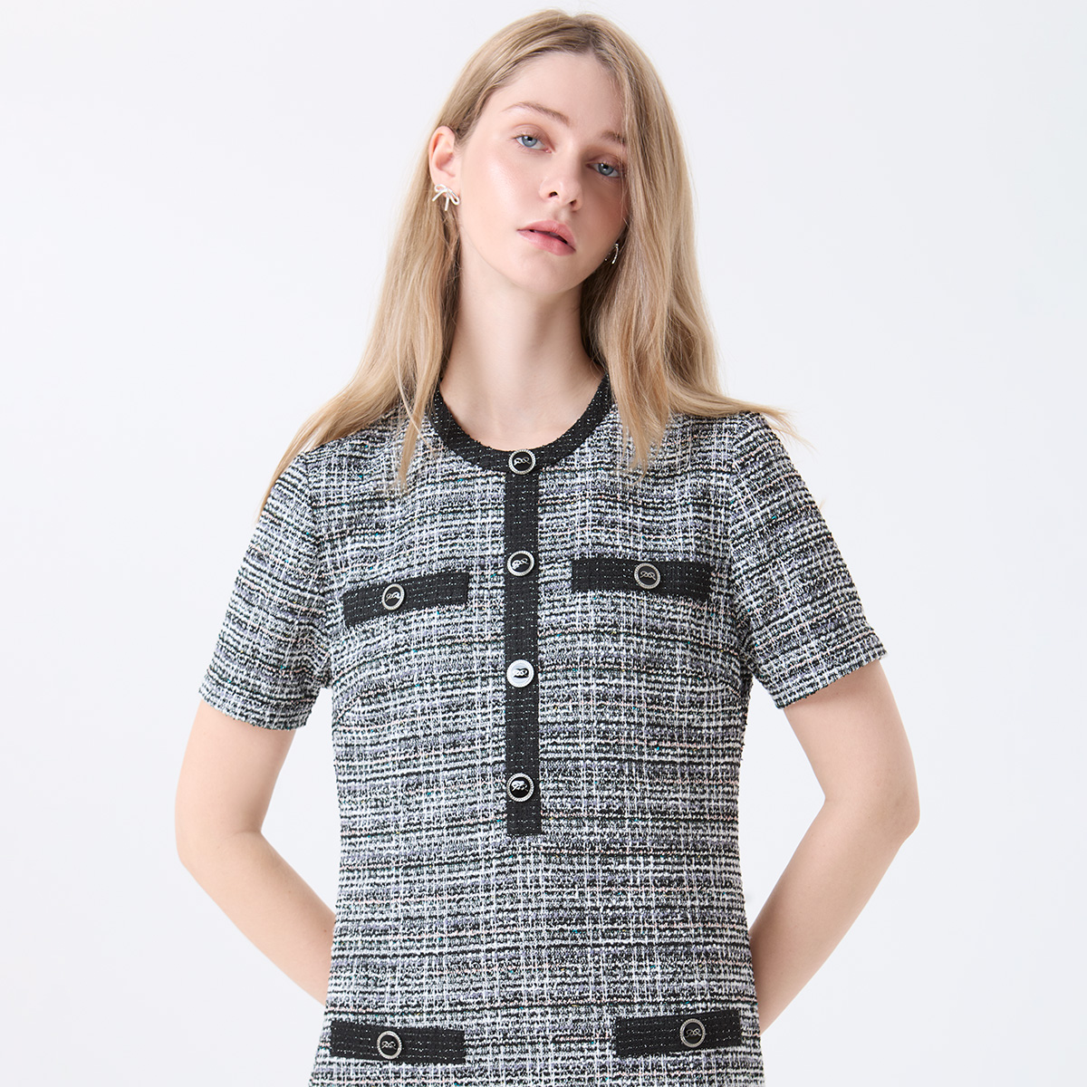 ชุดเดรส Knit Tweed สีดำจาก Ep ถ่ายทอดความหรูผ่านผ้า Tweed อันเป็นซิกเนเจอร์ของแฟชั่นลักชูรีมายาวนาน เนื้อผ้าทวีตถักให้ผิวสัมผัสนุ่มแต่ยังคงโครงสวยและมีน้ำหนักพอดี ช่วยเก็บสัดส่วนให้ดูเพรียวขึ้นทันทีที่สวม ดีเทลขอบแต่งดำและกระดุมโลโก้ด้านหน้าขับลุคให้ดูดี มีระดับ และพรีเมียมแบบไม่ต้องพยายาม โทนดำช่วยบาลานซ์รูปร่างให้ดูมั่นใจยิ่งขึ้น ไม่ว่าจะใส่เดี่ยวเพื่อให้เดรสเป็นตัวเอก หรือแมตช์กับคาร์ดิแกนเพื่อเสริมลุคโปรเฟสชันนัล ก็ยกระดับภาพลักษณ์ให้ดูแพง คำอธิบายสินค้า : – ชุดเดรสนิต ทวีต สีดำ คอกลม – แต่งขอบคอและแนวด้วยกระดุมขอบทอง – ตกแต่งกระเป๋าหน้าด้วยกระดุมขอบทองเข้าชุด – ซิปยาวซ่อนด้านหลัง พร้อมตะขอที่คอ – มีซับในทั้งตัว สวมใส่สบาย – ความยาวเดรสเหนือเข่า วัสดุ : 91%POLYESTER 8%ACRYLIC 1%SPANDEX คำแนะนำ : สามารถซักด้วยมือหรือเครื่องซักผ้าในโหมดปกติ รีดด้วยอุณหภูมิอ่อน * นางแบบสูง : 175 เซนติเมตร…